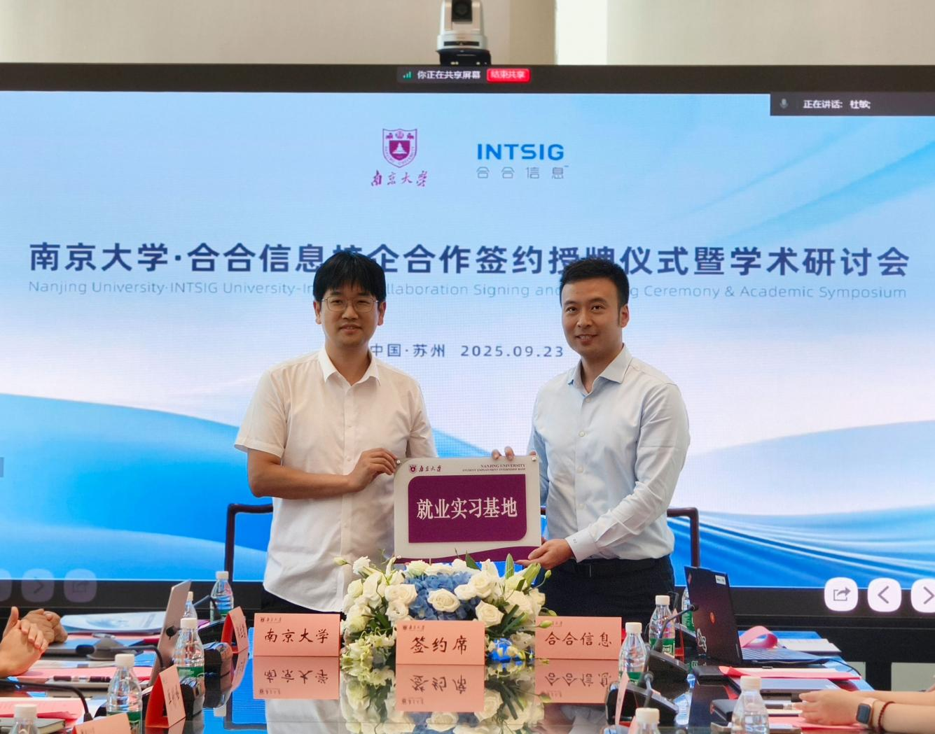 南京大学学生就业指导中心副主任曲继强(左)与合合信息人力与行政负责人杜杰(右)进行签约授牌。