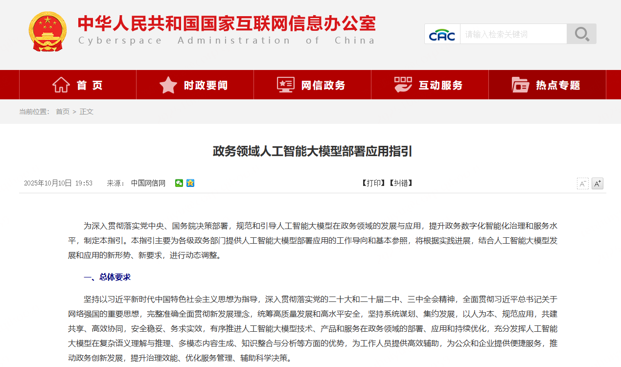 近日,中央网信办、国家发展改革委联合印发《政务领域人工智能大模型部署应用指引》(以下简称《指引》),紧密衔接《关于深入实施“人工智能+”行动的意见》要求,为各级政务部门提供了人工智能大模型部署应用的清晰工作导向与基本参照。