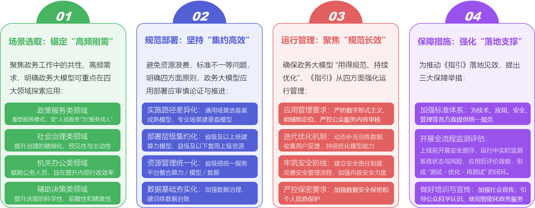 《指引》以“全生命周期管理”为核心逻辑,从场景选取、规范部署、运行管理到保障措施,形成闭环式指导框架,确保政务大模型应用“建得好、用得顺、管得严”。