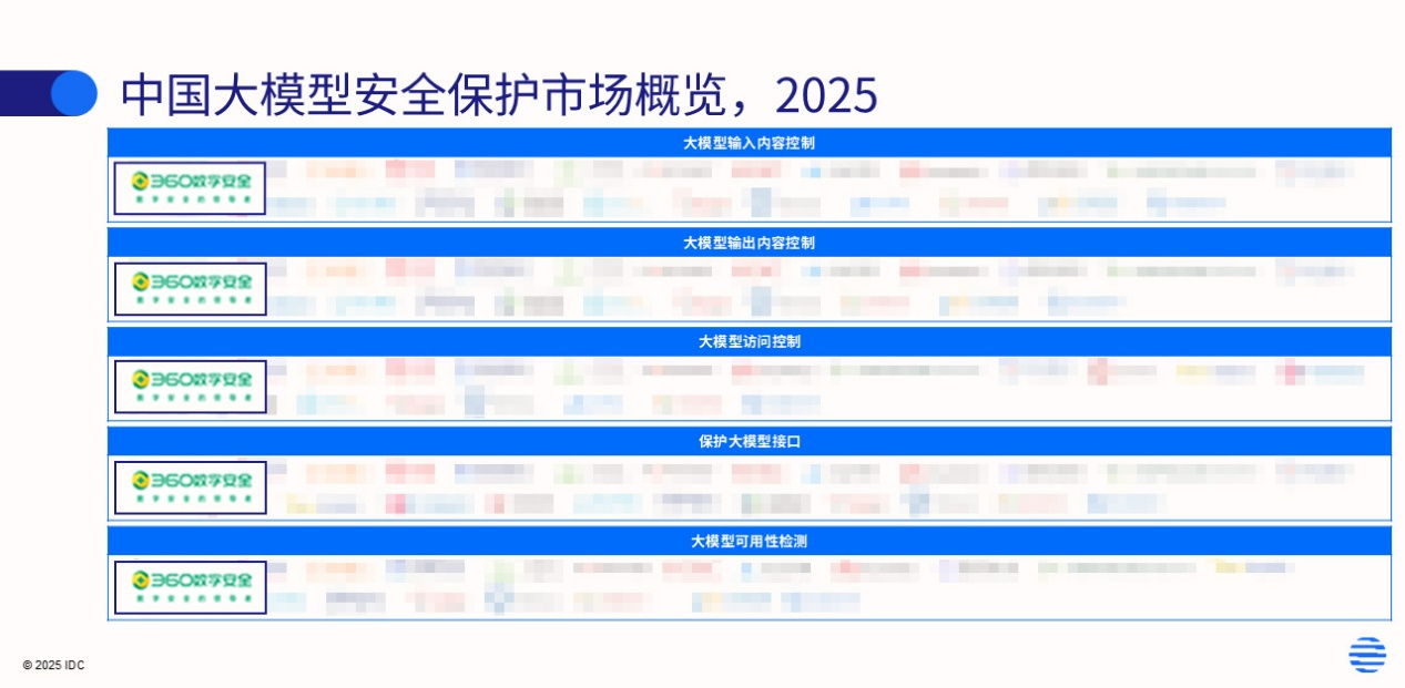 此前,在IDC《中国大模型安全保护市场概览,2025:全方位安全检测与防护构建可信AI》报告中,360在大模型可用性检测、保护大模型接口、大模型访问控制、大模型输入内容控制、大模型输出内容控制等细分领域均获得首位推荐。