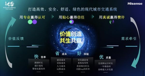 站在行业转折点,海信聚焦打造高效、安全、舒适、绿色的现代城市交通系统,以技术创新和真诚服务为用户和社会创造落地价值,用专业赢得认可,用贴心赢得信任,用真诚赢得赞许,最终构建价值创造、共生共赢的新型运行模式。