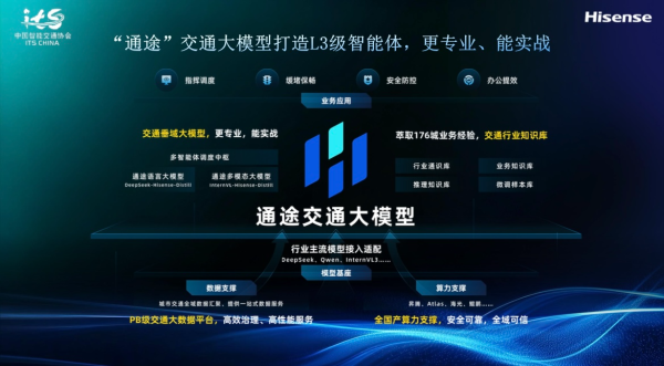 随着以大模型为引擎的交通智能体感知、思考、推理和交互能力的飞速发展,L3级交通智能系统将加速落地,在绝大多数场景下自主运行。基于多年历史积累的PB级交通大数据平台,在国产算力底座的支撑下,海信今年正式推出面向城市交通行业的L3级智能体——通途大模型。 萃取百余个城市业务经验,构建道路交通行业知识库,对通用模型进行自主微调,相对通用大模型更专业、能实战。