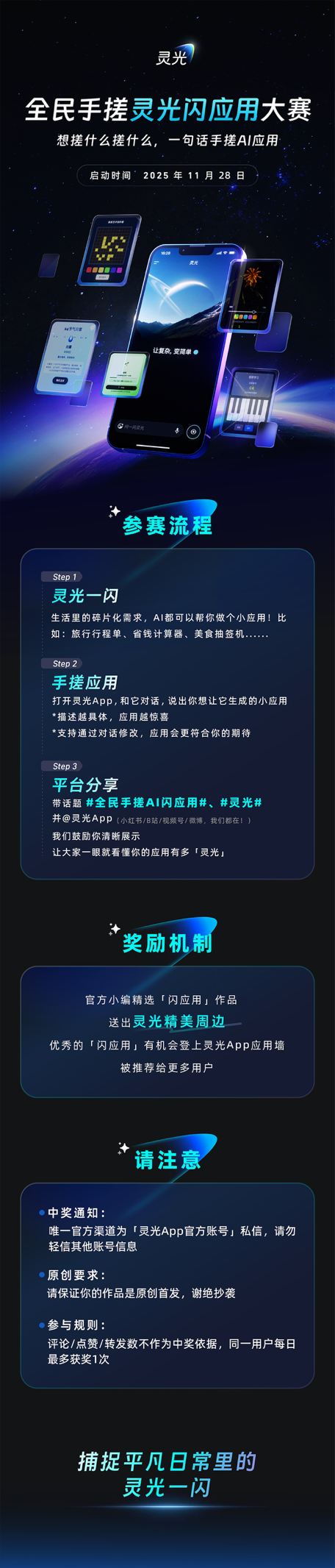 大赛突出零门槛、全民参与。参与者只需在灵光App内用自然语言对话描述想要的小应用功能,最快30秒即可生成一个可交互的应用,并分享至社交平台参与活动。