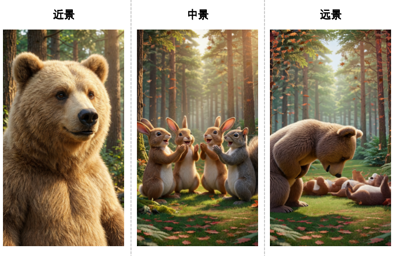 V5.5 的智能化程度还体现在它对模糊信息的理解能力上。即使用户只输入“一只小熊在森林里讲笑话”的简单提示词(Prompt),勾选音频( Audio )和多镜头( Multi-shot )后,AI 就能自动生成具有景别变化、搞笑情绪并搭配匹配笑声的完整片段。镜头骨架、情绪走向都由AI自动搭建,让普通人也能以“导演思维”进行表达。