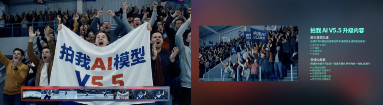 V5.5 的核心进步来自于底层模型的全面升级。此次更新首次支持音频(Audio)与多镜头(Multi-shot)同步生成,并强化了多角色音画同步能力。AI 能够根据用户输入的提示词,自动理解并生成完整的故事段落,而非仅仅提供单一镜头的素材。用户只需要输入一个简短的提示,AI 就能完成镜头推进、景别切换、人物对白、环境声和背景音乐的生成,直接呈现一个可被使用的叙事片段。