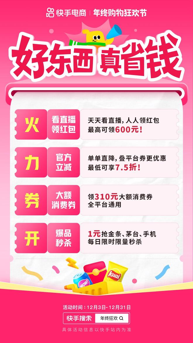 为助力商达更好把握秋冬消费热点及年末节日节点,快手电商宣布推出2025快手年终购物狂欢节活动。本次活动以“好东西 真省钱”为主题,活动周期从12月3日持续至12月31日。