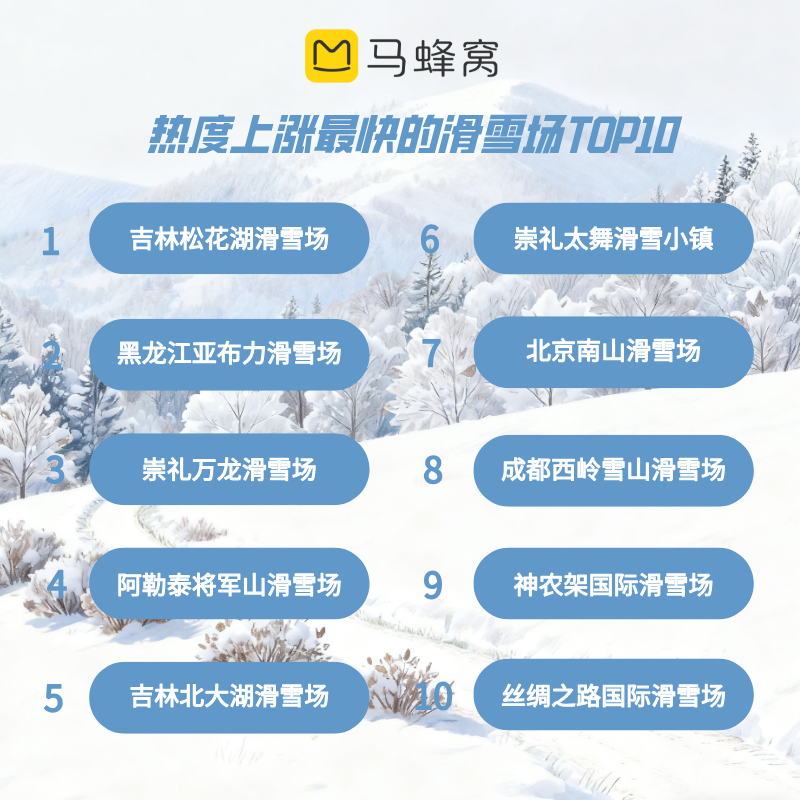 对于滑雪爱好者来说,一年一度的“开板”已成为冬季的头等大事,以东北为代表的北方滑雪胜地依旧实力领跑,吉林松花湖滑雪场以133%的涨幅位居热度上涨最快滑雪场榜首。黑龙江亚布力滑雪场、崇礼万龙滑雪场、阿勒泰将军山滑雪场同样名列前茅,成都的西岭雪山滑雪场以84%的热度涨幅成为南方地区关注度最高的滑雪场。