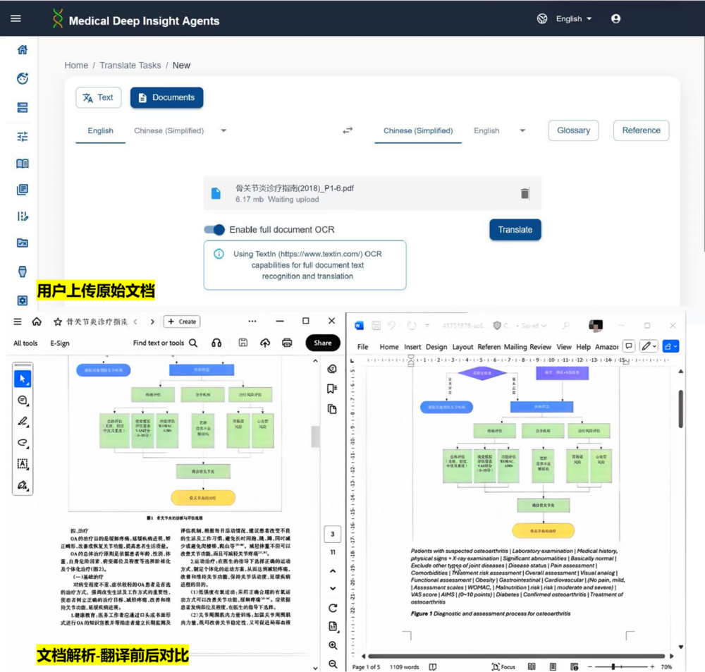 在实际应用中,用户一键上传原始文档,MDI平台即可在分钟级内完成数百页包含大量专业术语的医疗文档翻译任务,为临床诊疗、医学知识服务、医药研发等场景提供有效支撑。