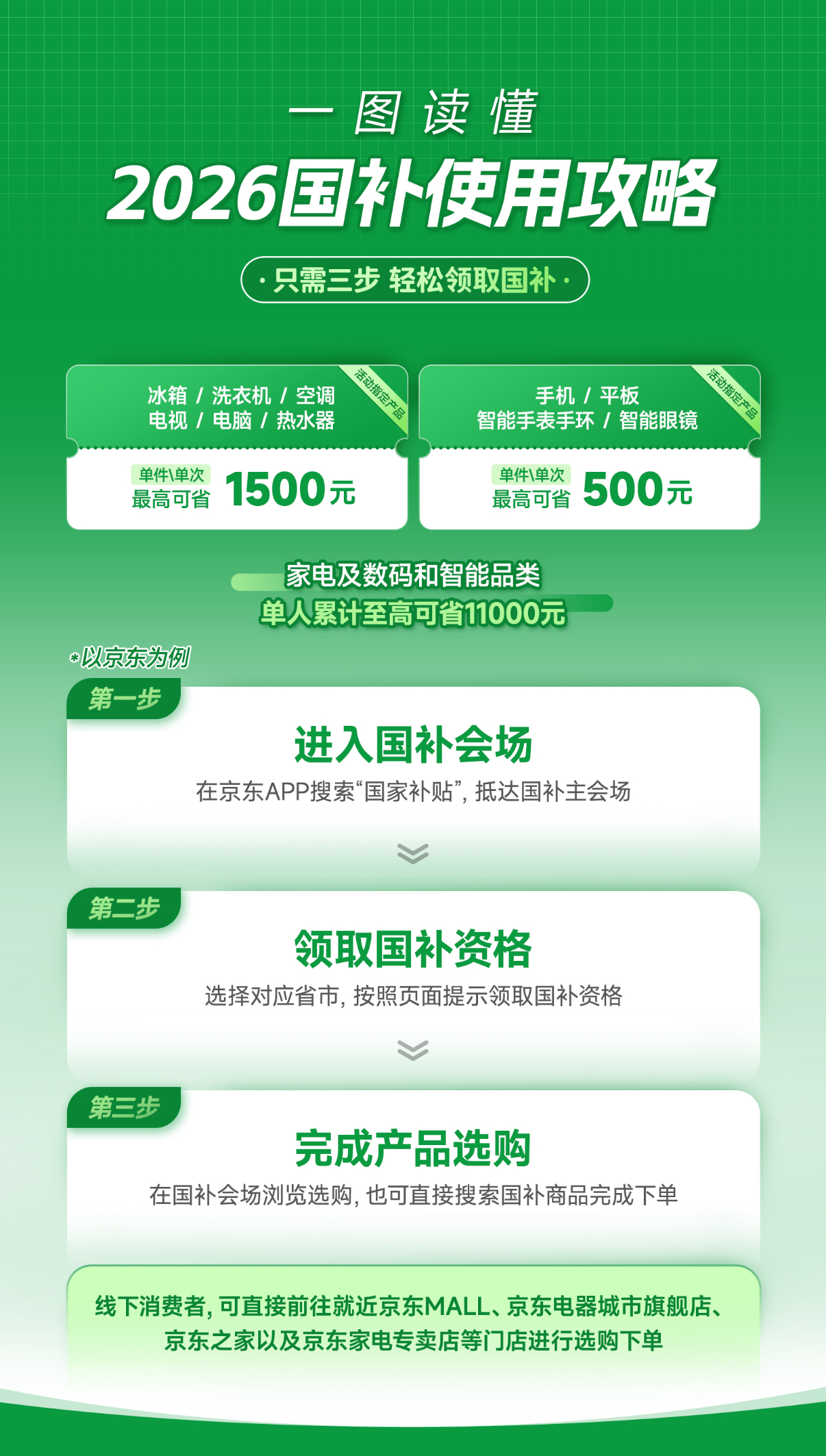 此外,京东MALL、京东电器城市旗舰店、京东之家、京东家电专卖店等线下渠道等同步展开国补承接。1月1日起,消费者可直接前往就近京东门店,咨询国补导购进行国补核销与下单。