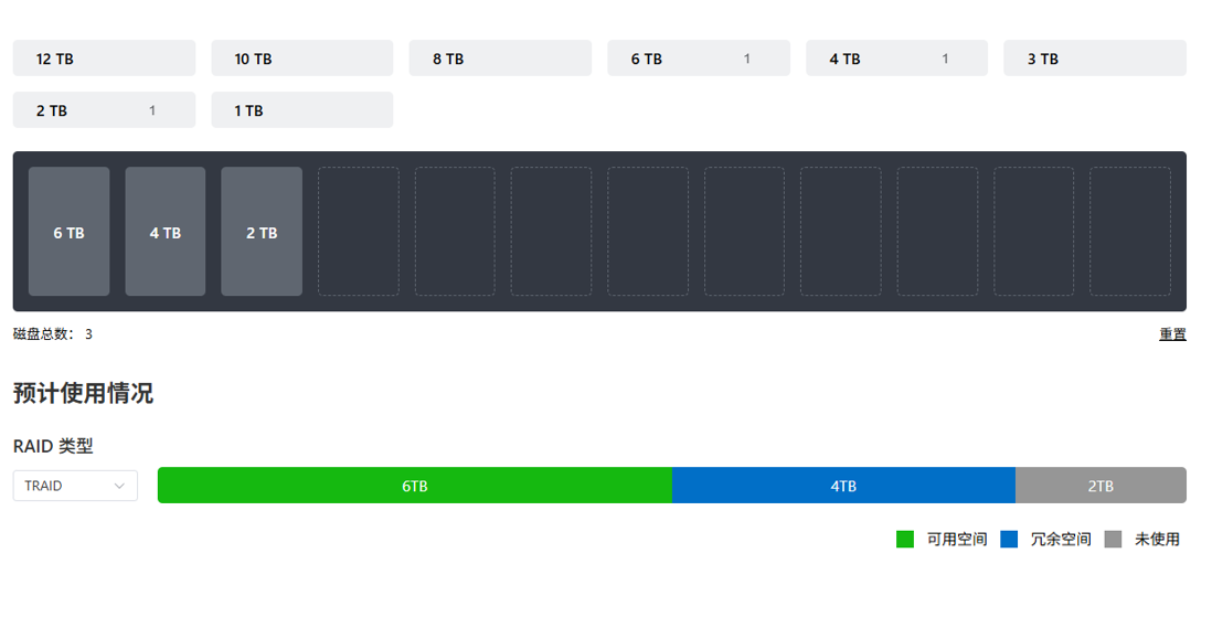 现在大家手里难免有新的大容量硬盘和旧的小容量硬盘。这些大小不一样的硬盘一起组阵列时,很多空间都会被浪费,所以怎么把这些硬盘的空间都充分用起来,就成了阵列技术最头疼的问题。现在以:2TB,4TB,6TB三块不同容量的硬盘组建RAID 5为例子。