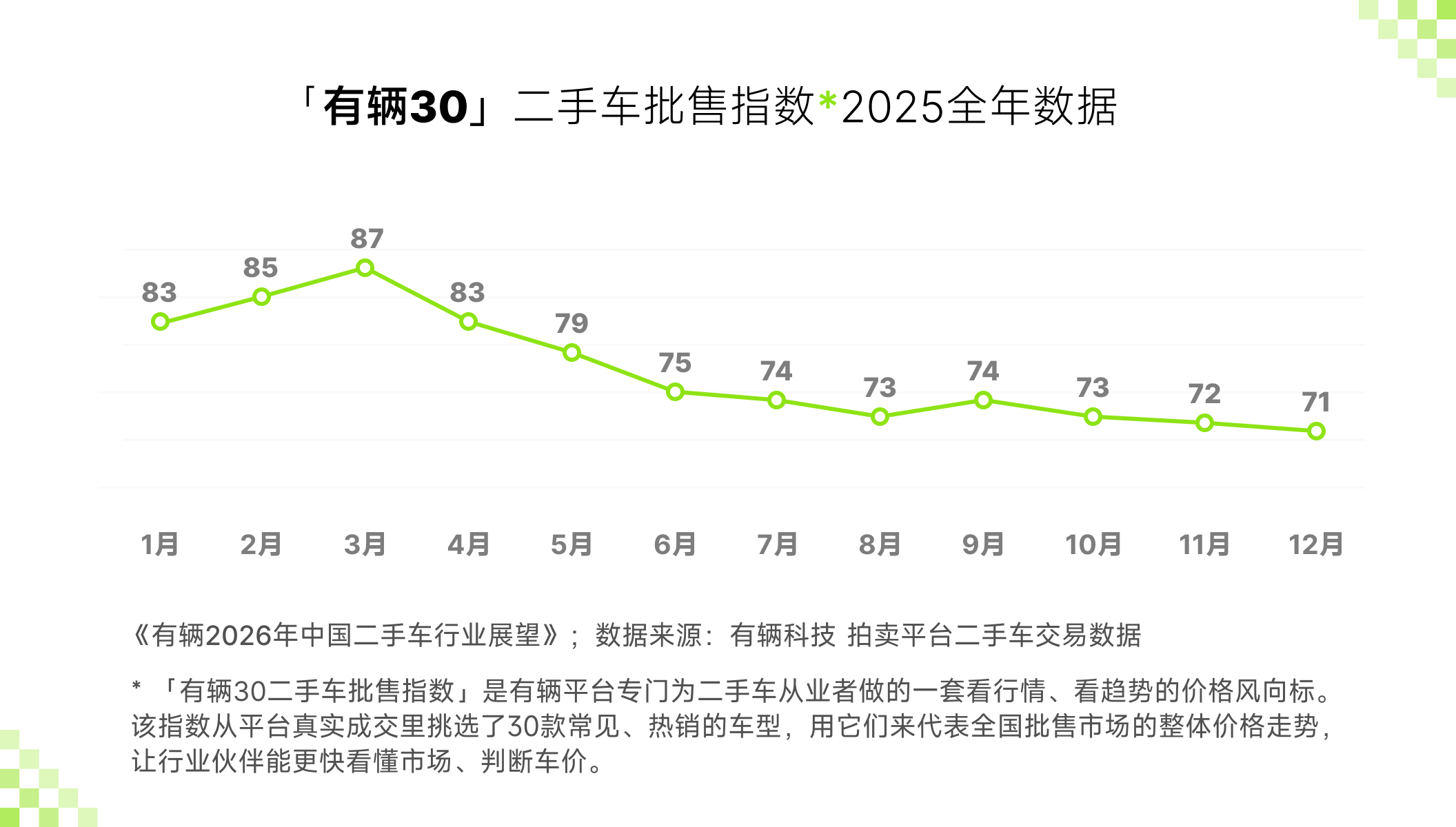 2025年“有辆30二手车批售指数”,主要反应车型固定的情况下的“车价变动”,自2025年5月发布“有辆30二手车批售指数”,该指数成为中国二手车经销商、汽车经销商集团了解二手车价格变动的重要指标,自2025年1月的“83”,到3月有辆30指数上浮达到“87”的年度高点,4月回落到“83”,四个月在暑期8月下挫10个点到达“73”,并在2025年年底的12月达到“71”,指数的波动反应了年度二手车价格的周期性波动。