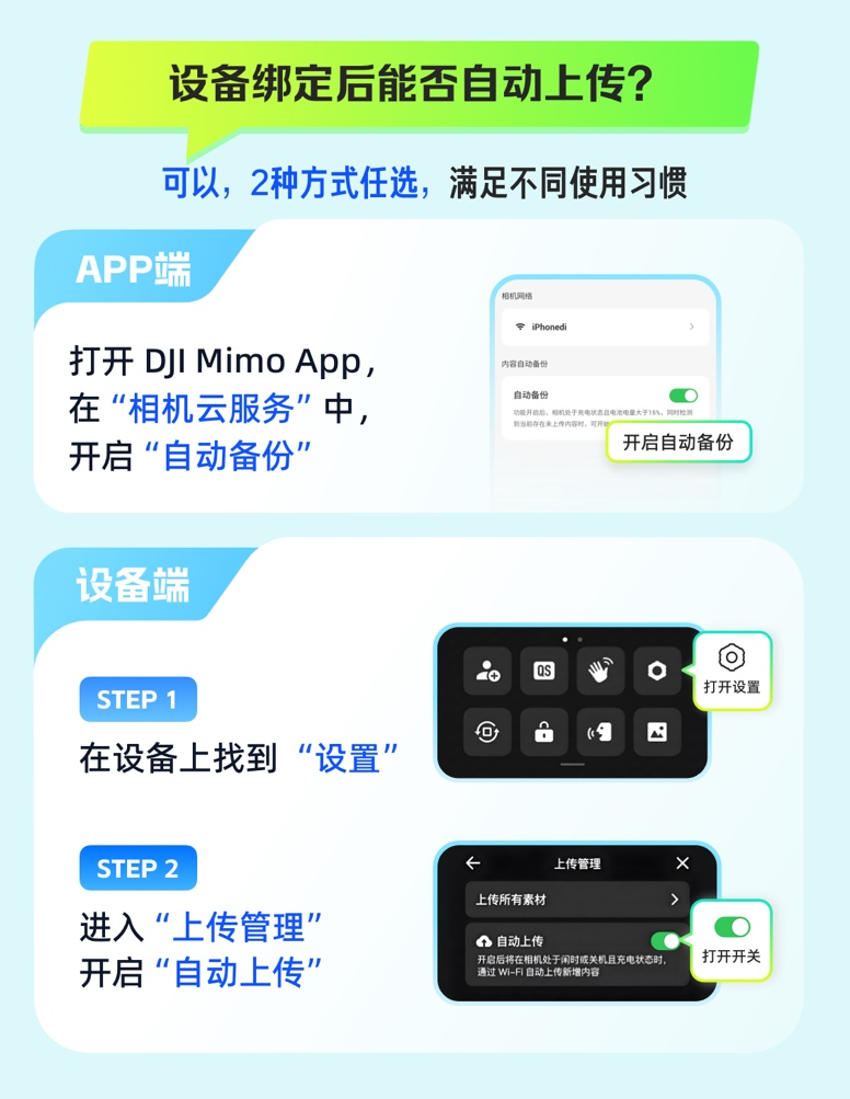 如需自动上传影像文件,用户可在DJI Mimo APP端开启“内容自动备份”,或在相机设备端的“设置-上传管理”中开启“自动上传”。照片备份成功后,可下载夸克APP,在夸克网盘文件中查看来自DJI的影像文件。