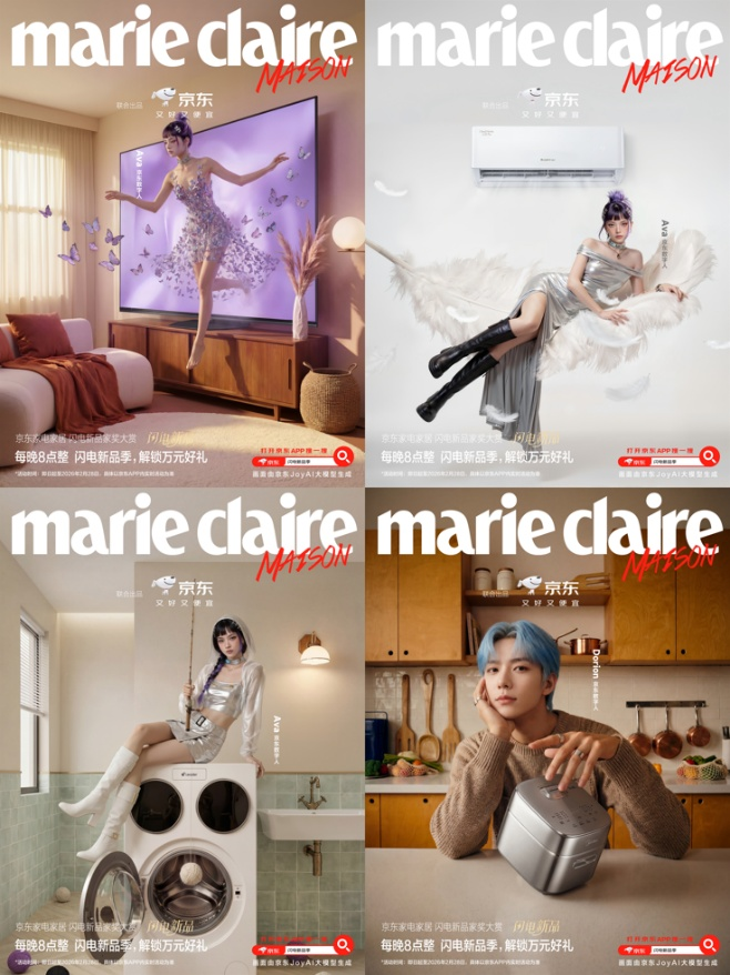 值得注意的是,无需传统棚拍流程,依托京东JoyAI大模型即可产出媲美时尚大片质感的海报。这些海报不仅登上《嘉人》新媒体矩阵,更将家电家居新品与数字人IP有机融合,既保证了高端时尚的视觉调性,又简化了内容制作流程。