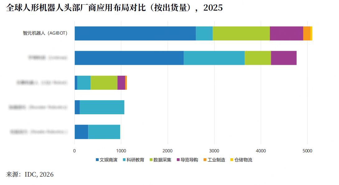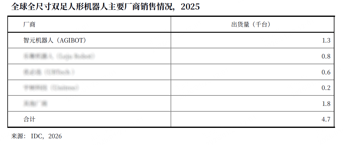 根据IDC数据,2025年全球人形机器人出货量约1.8万台,同比增长约508%,中国厂商占主导,智元以5,200台的出货量稳居全球榜首,市场份额显著领先。这一数据标志着智元不仅完成了从技术研发到产品量产的关键跨越,更在规模化交付这一硬性指标上体现了优势,确立了在全球市场的领导者地位。
