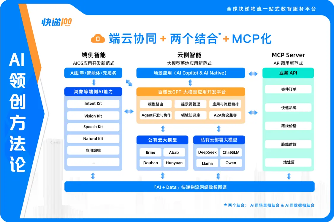 而在三大支柱背后,则是快递100旗下 “快递物流数智图谱”和“百递云GPT平台”构成的技术底座。这个底座具备自我进化能力,新场景开发周期缩短至1-2个月,可支撑多场景AI产品快速迭代。