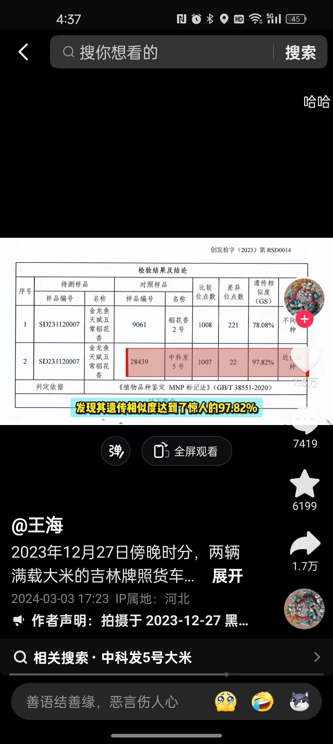为印证相关疑惑,王海在金龙鱼天猫旗舰店购买五常大米作为样本,并送至海南崖州湾分子鉴定检测中心进行鉴定。据该机构提供检测报告数据,样本与稻花香2号的植物DNA遗传相似度仅78.08%,但与中科发5号的植物DNA遗传相似度达到97.82%,被判定为近似品种。