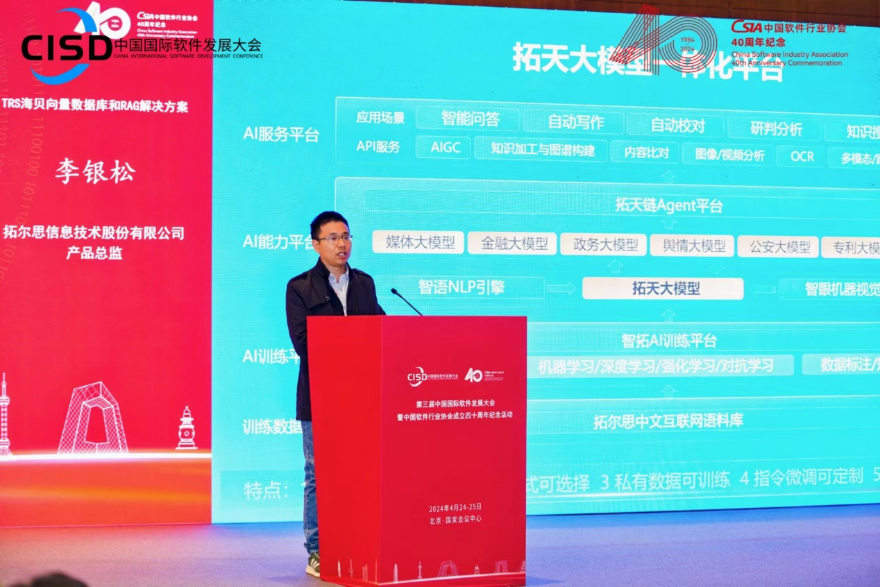 拓尔思产品总监李银松发强调TRS海贝向量数据库系统是市场上极少数同时符合搜索数据库标准和向量数据库标准的纯国产自研软件之一。该系统采用高性能的HNSW向量索引,可以搭配大模型(深度学习引擎)实现语义搜索、跨模态搜索以及融合搜索等,广泛用于企业搜索、检索增强生成(RAG)以及智能问答等应用场景。