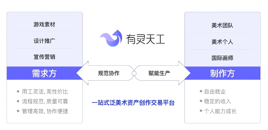 有灵天工平台是网易伏羲自研的专业美术服务平台,为美术服务提供灵活、规范、高效的工作环境,让美术服务更加简单。有灵天工平台面向需求方提供灵活用工的选择,降低用人成本,并通过平台化的流程、规范保证交付质量;面向服务方提供自由就业的机会,足不出户就可参与大型项目,并提供美术交流、学习、成长的平台环境。