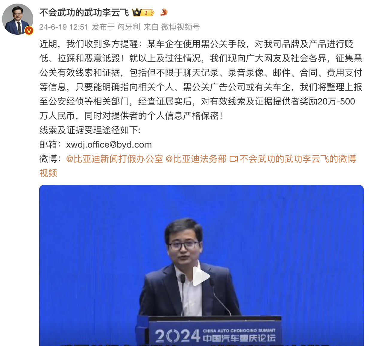 6月19日,比亚迪品牌及公关处总经理李云飞在微博发文,面向社会公开征集黑公关证据。