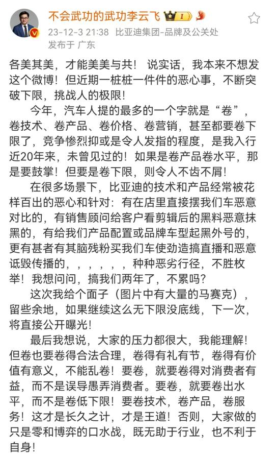 2023年12月3日,李云飞发布微博,批评行业黑公关的“卷下限”行为。他直言不讳地表示:“(车企)如果是卷产品卷水平,那是要鼓掌;但要是卷下限,则令人不齿不屑”。“要卷,就要卷出水平,而不是卷低下限”。