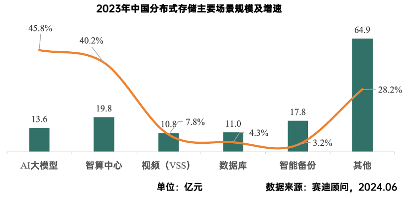中国分布式存储市场规模呈现整体高速、部分传统领域低速并行的新特点。2023年,中国分布式存储市场规模达到137.9亿元,增速高于整体市场,保持高速增长态势。从细分市场看,文件存储、全闪存、金融、科教等产品及各行业规模均较快增长,但在数据库等传统场景中,由于IT基础设施的架构相对固定,扩容成本较高,分布式存储的优势不够明显,增速偏低。