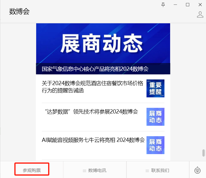 2.搜索数博会微信公众号→点击左下菜单栏“参观购票”→选择相应时段完成购票→凭生成的二维码以及身份证入场。