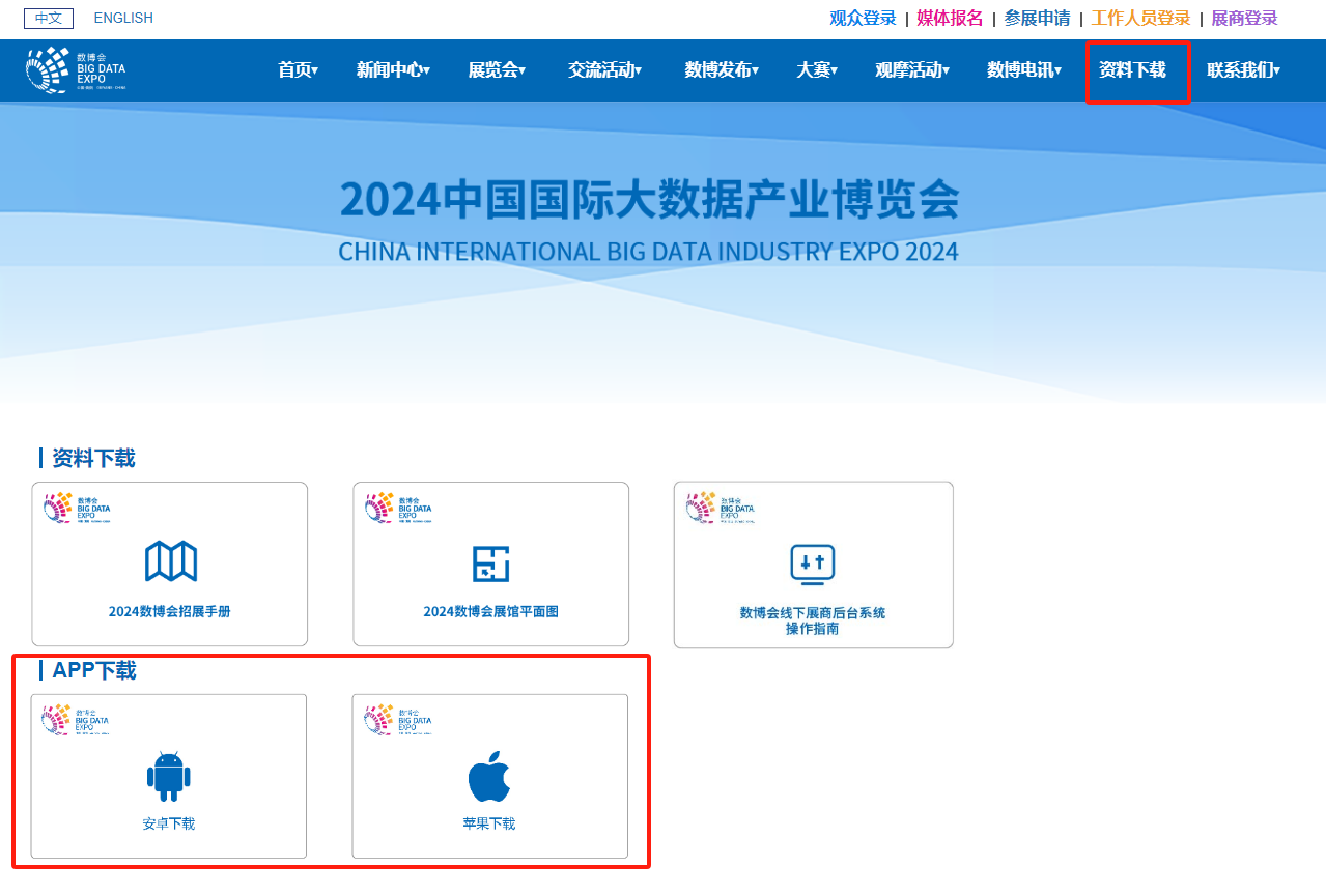 4.在数博会官网首页“资料下载”栏目(https://www.bigdata-expo.cn/media)下载对应本人手机版本的数博会APP→购票→参观购票→选择相应时段完成购票→凭生成的二维码以及身份证入场。