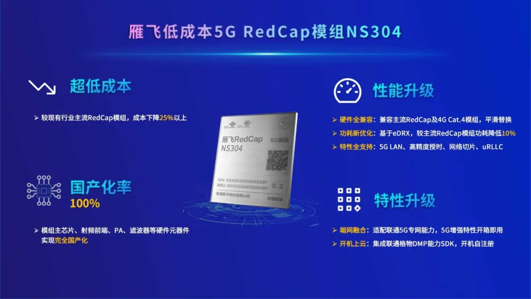 在5G技术浪潮中,联通数科物联网再次领航前行,继全球首款商用5G RedCap模组发布后,本次重磅发布雁飞低成本5G RedCap模组,以超高性价比与兼容性赢得市场瞩目。模组采用100%全国产化设计实现自主可控;与行业主流RedCap模组相比价格下降25%以上;在性能方面全面升级,硬件设计上兼容主流RedCap及Cat.4模组,为客户提供零成本升级替换方案,功耗上进一步降低10%,且支持5G行业增强特性;模组与联通5G行业专网深度融合,实现端网协同、开机上云等差异化优势,为消费数传、电力能源、视频监控等场景提供定制化解决方案,首发价仅169元,引领行业风向标。