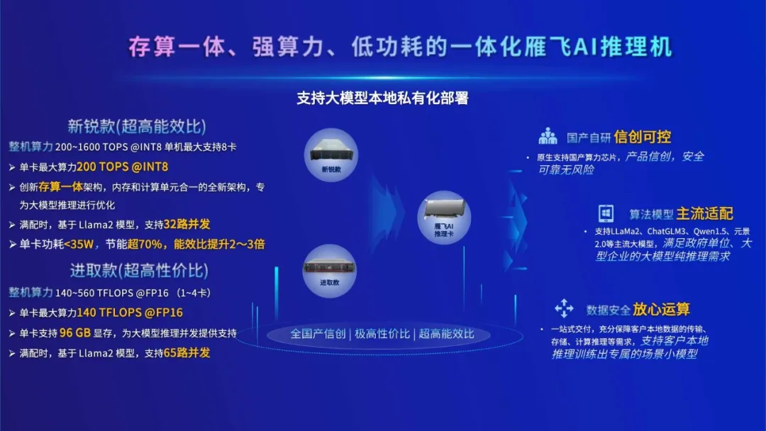 与此同时,联通数科物联网在AI推理领域亦有重大突破,打造了包括新锐款和进取款两款雁飞AI推理机。新锐款以超高能效为核心,整机算力横跨200至1600 TOPS @INT8,单机最大支持8卡,采用创新的存算一体架构,将内存与计算单元完美融合,专为大模型推理优化,单卡功耗控制在35W以下,节能效率超过70%,能效比显著提升2至3倍。而进取款则以高性价比著称,整机算力范围从140至560 TFLOPS @FP16(1~4卡),支持多达65路数据并发处理。两款产品支持国产算力芯片,实现信创安全可控;支持联通元景、LLaMA、ChatGLM等主流大模型,满足政府单位、大型企业的大模型纯推理需求;提供一站式交付,支持客户本地推理训练出专属的场景小模型,全面赋能企业数字化转型。