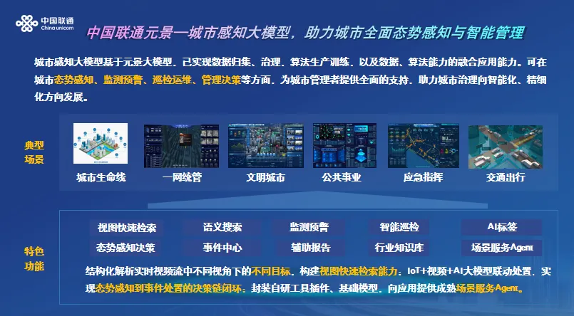 面对城市智能化不断升级,联通数科物联网还针对城市管理推出了城市感知大模型,它的出现让城市像“人”一样有了思考能力。