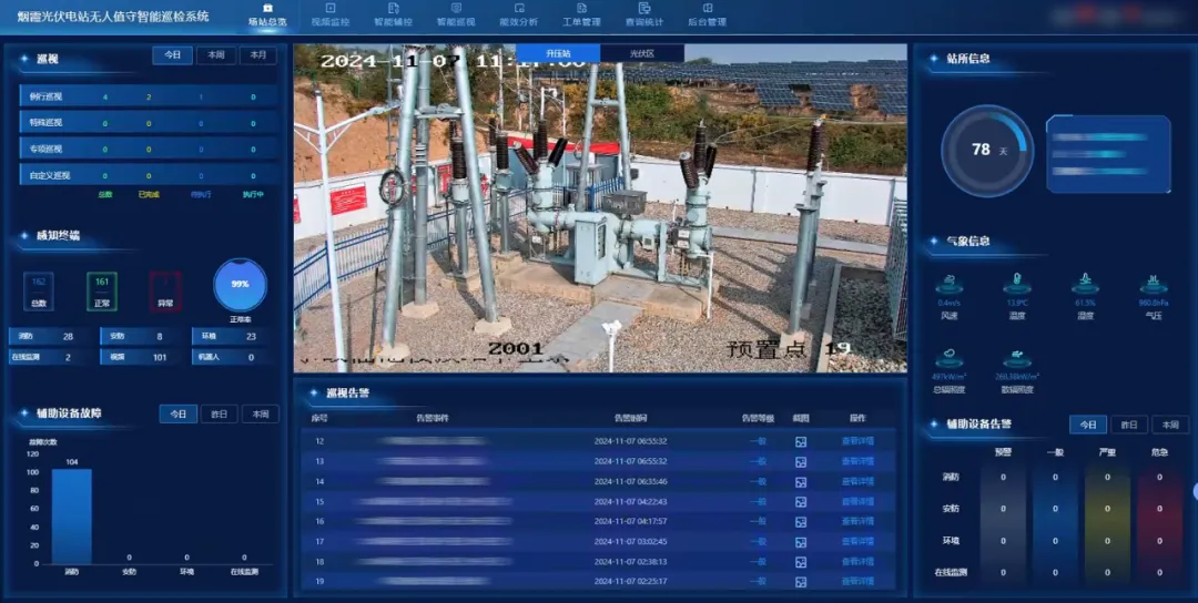 烟霞无人值守智能巡检系统深度融合升压站巡视、智能辅控、无人机巡视、组串分析、智慧安防等多个功能模块,通过配备红外双光谱测温云台、智能球机、传感器等前端数据采集设备,结合智能巡检算法,实现光伏场站日常巡检任务全覆盖及场站全天候智能监控,有效代替人工巡检模式,极大提升运维效率与安全性。
