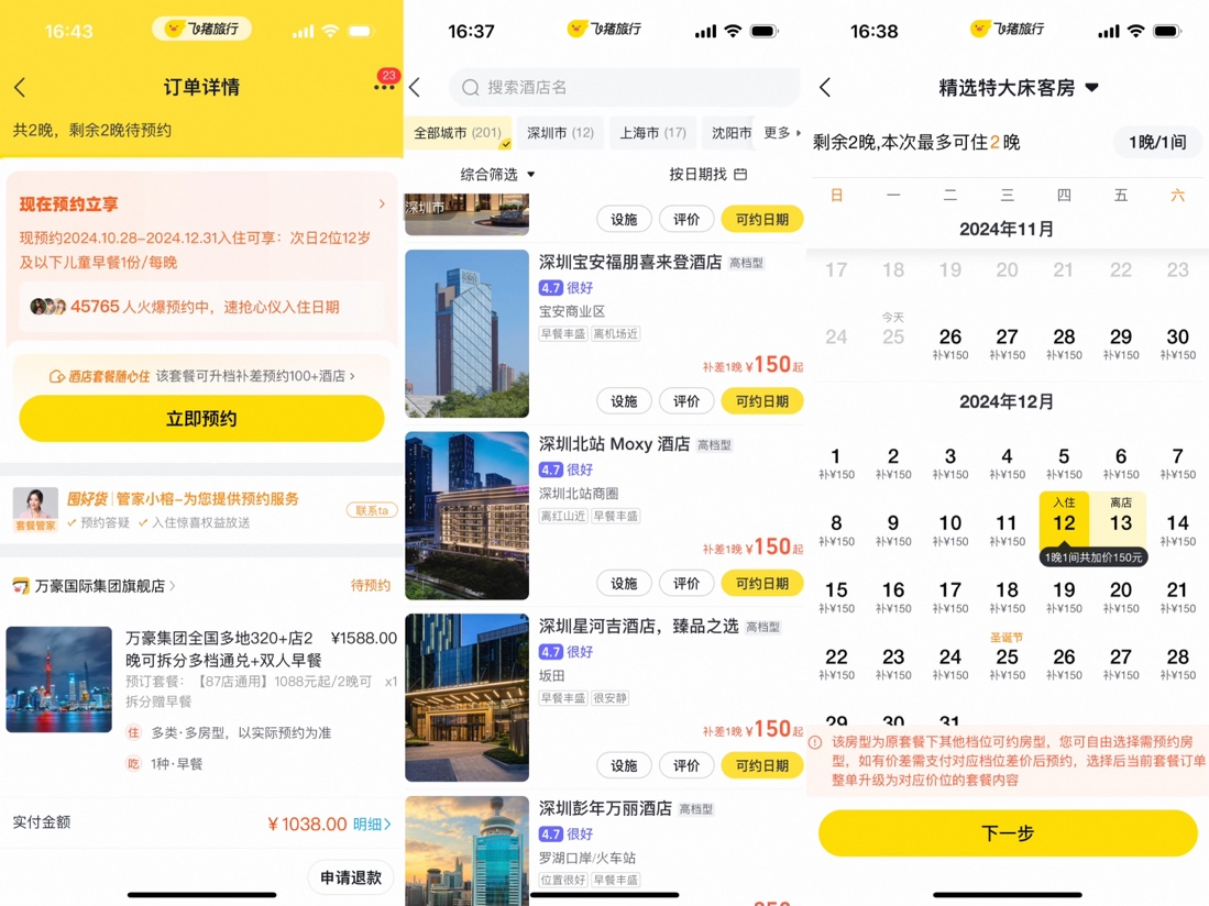 以双11期间卖出11万份的“万豪全国320店通兑”套餐为例,消费者若已购买1088元档位的套餐商品,根据产品页面可“跨档预约”入住。飞猪数据显示,截至目前,“跨档预约”功能已覆盖超300个双11酒店活动商品。