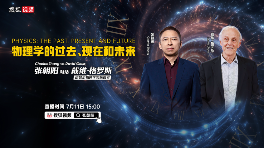 7月11日15点,搜狐创始人、董事局主席兼首席执行官、物理学博士张朝阳,将与2004年诺贝尔物理学奖获得者、美国国家科学院院士、中国科学院外籍院士、加利福尼亚大学圣塔芭芭拉分校教授戴维·格罗斯(David Gross)开展一场科学对谈,围绕“物理学的过去,现在和未来”主题,探讨基础科学最前沿。搜狐视频“张朝阳”账号将全程直播。