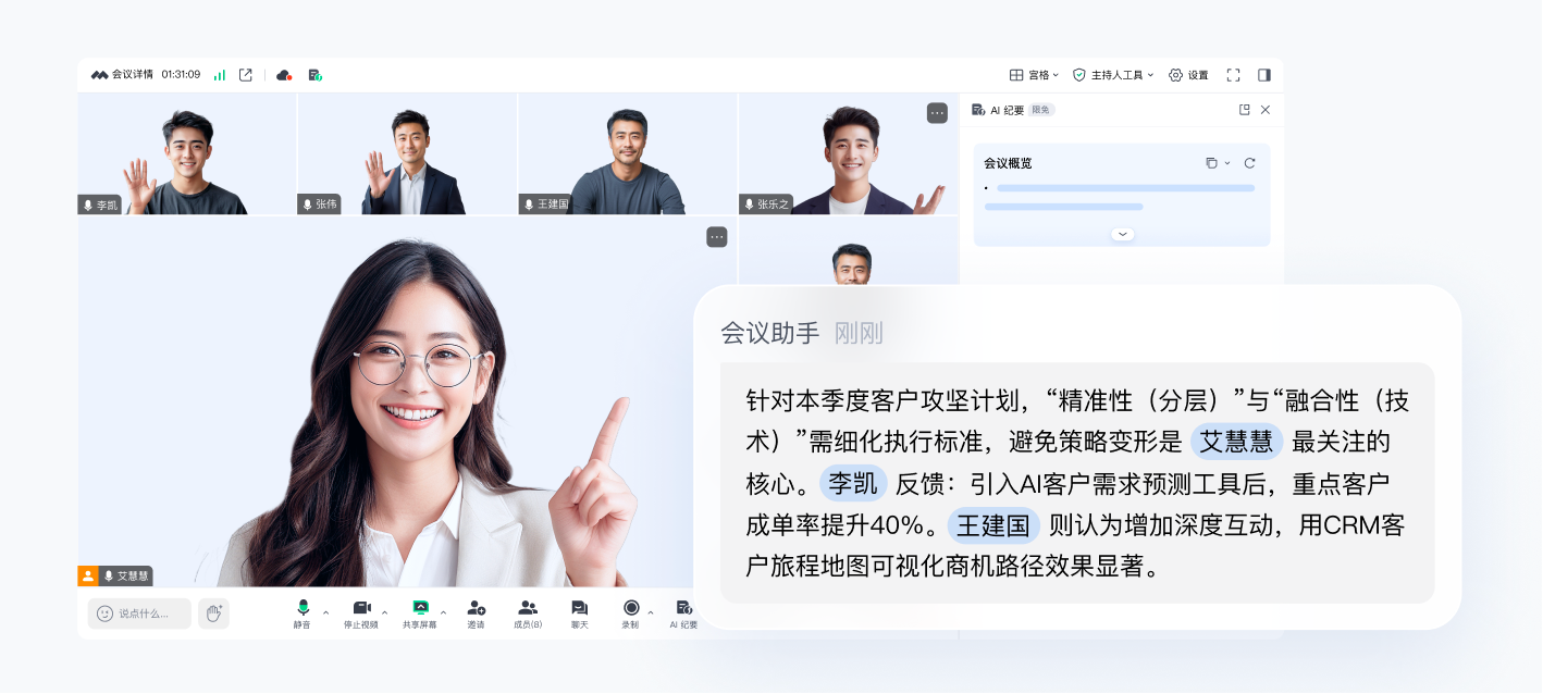 在会议过程中,“AI纪要”每2分钟自动刷新内容,其中包含近2分钟的实时讨论要点,以及从会议开始到当前的完整概要。无论是管理者实时把控会议进度,还是参会者快速同步信息,均能实现信息不滞后、决策更迅速。