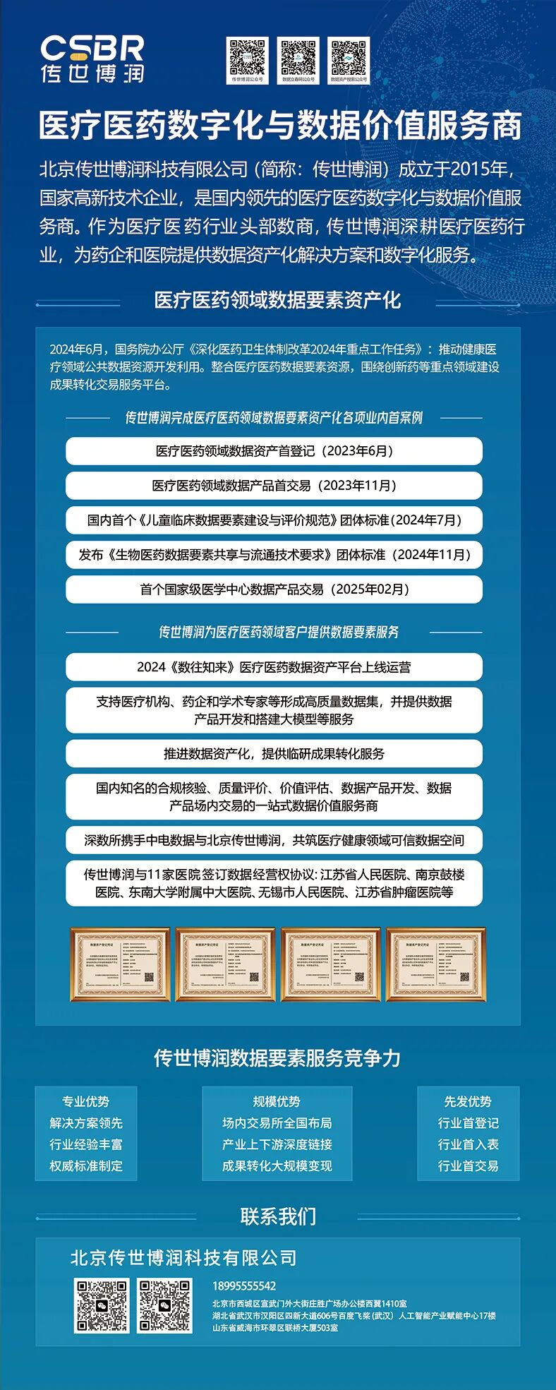 凭借着自身数据资产化的经验和实践,传世博润已经成为北京国际大数据交易所、江苏数据交易所、贵阳大数据交易所、深圳数据交易所、广州数据交易所等多个数据交易所数据商。传世博润将协同生态合作伙伴,加快医疗医药数据要素服务专区,为更多的医疗机构和医药企业提供数据资源开发利用的研究服务以及研究成果的转化服务,助力更多合作伙伴实现数据资源的价值。