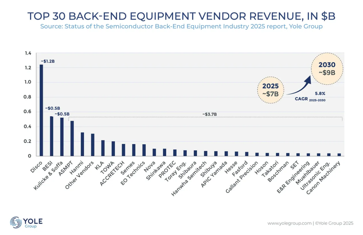 知名分析机构Yole Group 估计,2025 年后端设备总收入约为 69 亿美元,预计到 2030 年将增长至 92 亿美元,复合年增长率为 5.8%。这一增长主要源于用于构建 HBM 堆栈、芯片组模块和高 I/O 基板的技术,它正在重塑供应商路线图、晶圆厂建设以及代工厂、IDM 和 OSAT 等买家格局。简而言之,能够放置、对准、键合和保护日益复杂的封装的系统正在推动市场向前发展。