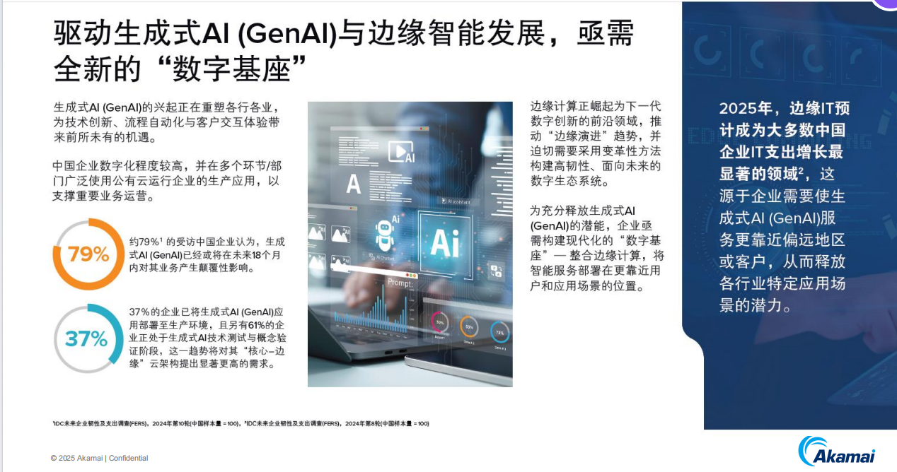 【赛迪网讯】在数字化浪潮风起云涌的当下,生成式AI宛如一颗璀璨的新星,照亮了企业数字化转型的新路径。Akamai委托IDC开展的研究,深入剖析了生成式AI如何驱动“边缘演进”,揭示了未来企业数字基础设施发展的新趋势。Akamai亚太区与全球云架构师团队总监李文涛接受赛迪网采访时表示,这一研究不仅为亚太地区,尤其是中国企业的数字化转型提供了宝贵的指引,更凸显了中国企业在全球数字化竞争中的独特地位与潜力。