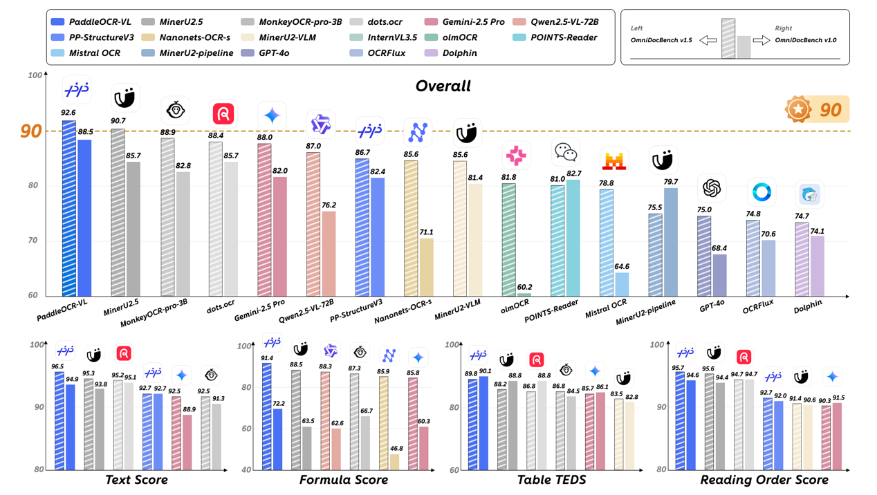 【赛迪网讯】10月16日晚,百度正式发布并开源自研多模态文档解析模型PaddleOCR-VL。在全球权威文档解析评测榜单OmniBenchDoc V1.5中,PaddleOCR-VL以92.6分取得综合性能全球第一成绩,四大核心能力(文本、表格、公式、阅读顺序)全线SOTA,超越 GPT-4o、Gemini-2.5 Pro、Qwen2.5-VL-72B等主流多模态大模型,以及MonkeyOCR-Pro-3B、MinerU2.5、dots.ocr等OCR专业模型,刷新全球OCR VL模型性能天花板。