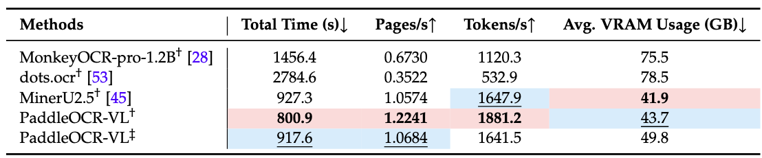 推理方面,在单张A100GPU上,PaddleOCR-VL每秒可处理1881个Token,推理速度较 MinerU2.5提升14.2%,较 dots.ocr 提升253.01%。