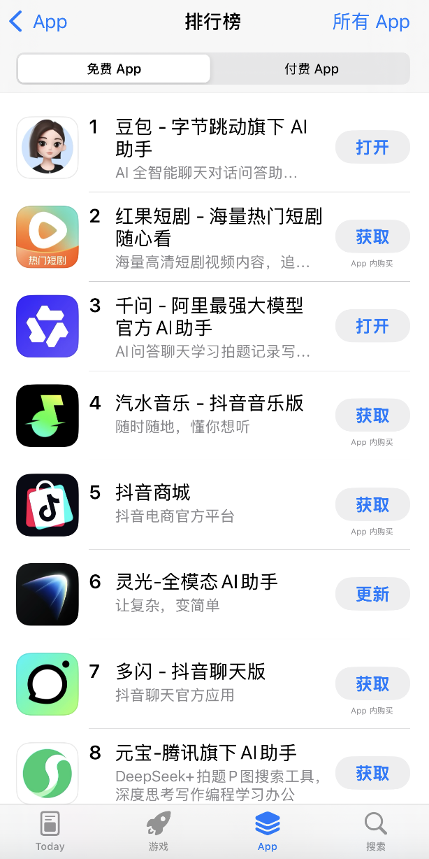 【赛迪网讯】11月17日,阿里旗下AI助手千问App率先登场;18日,通用AI助手灵光紧随上线。凭借这两款产品,“阿里系”在苹果App Store中国区免费榜前六强势撕开一道口子,打破了字节跳动长期盘踞的“前五全包”格局。