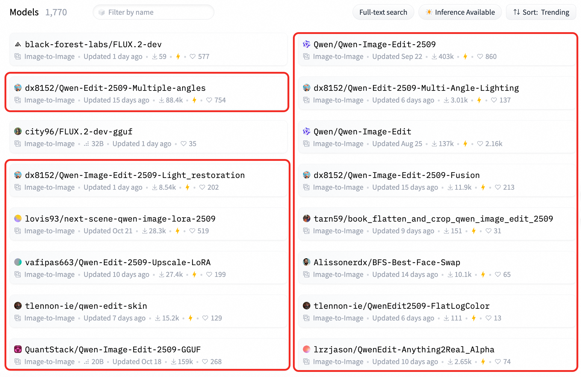 Qwen-Image系列模型自开源发布以来,即刻成为全球AI社区最火热的开源视觉基础模型,当前总下载量已突破300万次。在全球最大的AI开源社区HuggingFace的“图生图”榜单前15中,有13个都是Qwen-Image的原生或衍生模型,网友们纷纷基于Qwen-Image魔改出各种新版本等,比如镜头控制lora效果,可实现图片的多角度重新编辑,目前仍高居HuggingFace的演示空间(Space)榜单第一。如今,开源社区的优秀创意也已吸纳到新改版的Qwen-Image-Edit模型中,基模上就可实现打光、换视角等特色效果。