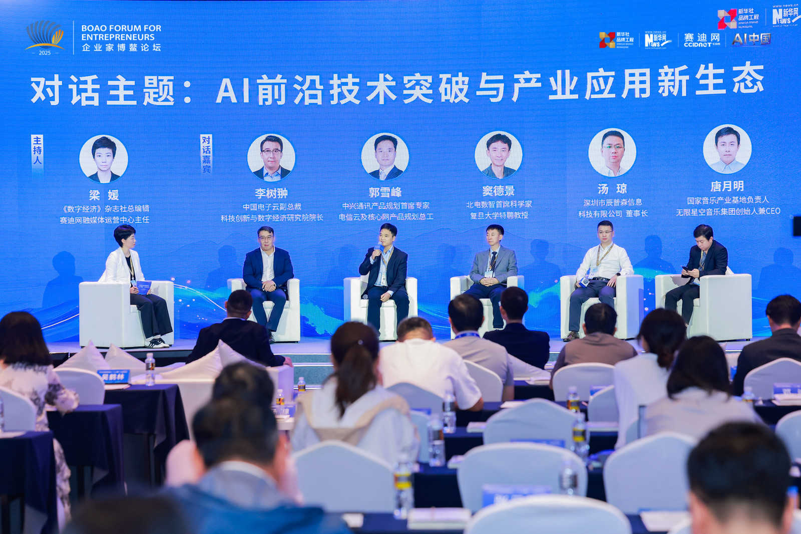 《数字经济》杂志社总编辑、赛迪网融媒体运营中心主任梁媛主持了以“AI前沿技术突破与产业应用新生态”为主题的圆桌对话。中国电子云副总裁、科技创新与数字经济研究院院长李树翀,中兴通讯产品规划首席专家、电信云及核心网产品规划总工郭雪峰,北电数智首席科学家、复旦大学特聘教授窦德景,深圳市辰普森信息科技有限公司董事长汤琼,国家音乐产业基地负责人、无限星空音乐集团创始人兼CEO唐月明作为嘉宾参与了圆桌对话,对话聚焦技术落地挑战、产业链协同、安全治理等议题。