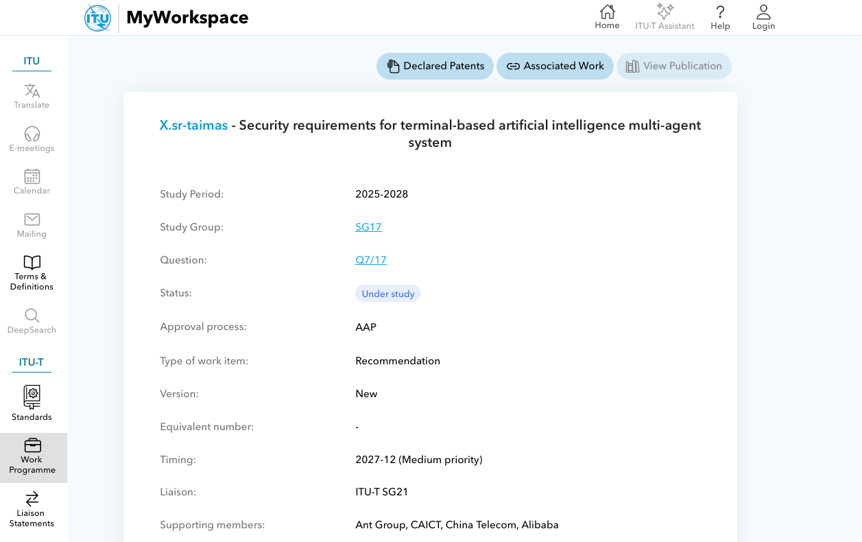 【赛迪网讯】在近日于瑞士日内瓦落幕的国际电信联盟(ITU)电信标准化部门(ITU-T)第17研究组会议上,为响应《关于共建终端智能体生态的倡议》,由蚂蚁集团牵头,联合中国信息通信研究院泰尔终端实验室、中国电信等单位共同提出的《终端多智能体系统可信要求》国际标准项目(以下简称“标准”),经全会审议一致通过,正式成功立项。
