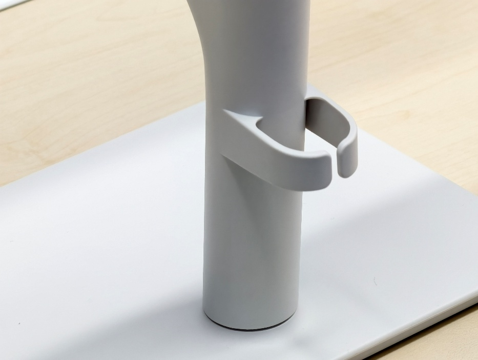 显示器支架支持上下110mm调节、俯仰-5°~21°、水平旋转±30°、垂直旋转90°,可轻松切换竖屏模式或适应不同坐姿。整体外观简洁、统一,背部设置了束线设计。底座平整占地不大,同时提供良好稳定性。