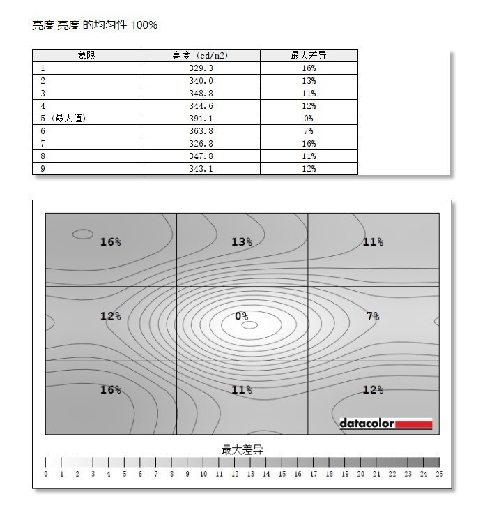 在亮度均匀性测试中,戴尔S2725DSM显示器的表现较为出色。整屏亮度差异控制在16%以内,其中屏幕中央区域亮度最高,实测达到491.1 nits。可以看出,尽管戴尔S2725DSM显示器是一款入门级显示器,但在实际显示性能上并未因定位而妥协,其整体表现明显优于同级多数产品。
