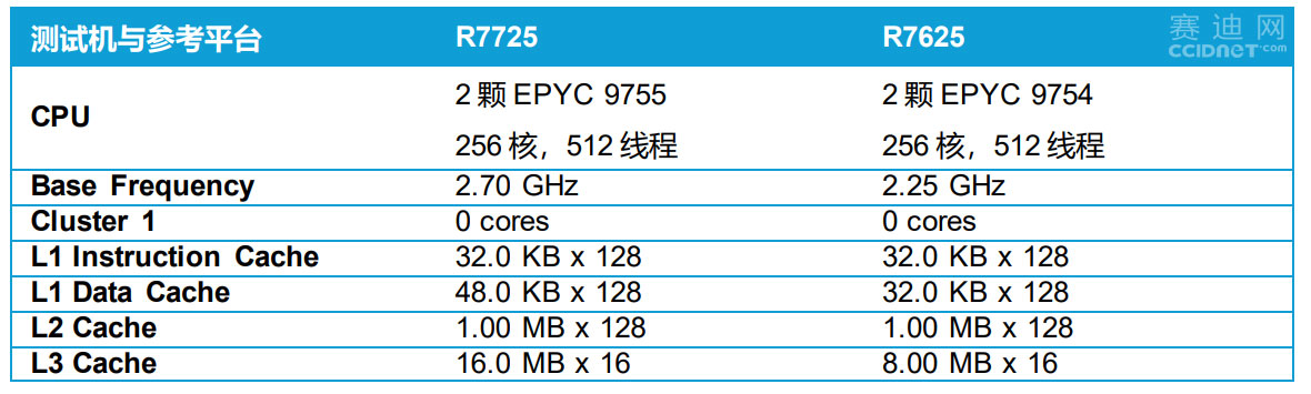 测试机R7725配置2颗AMD EPYC 9755处理器,参考平台R7625配置2颗AMD EPYC 9754处理器,均为128核心,256线程。设备系统均为Rocky Linux 9.6(Blue Onyx)。