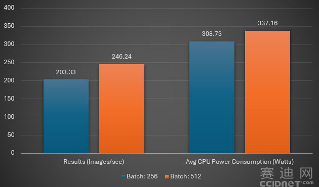 可以看到,当Batch Size从256增加到512时,吞吐量从203.33提升到246.24 images/sec,提升约21%。这说明R7725在处理更大批量推理任务时,CPU的多核资源能够得到更充分利用,多线程计算效率显著提升。