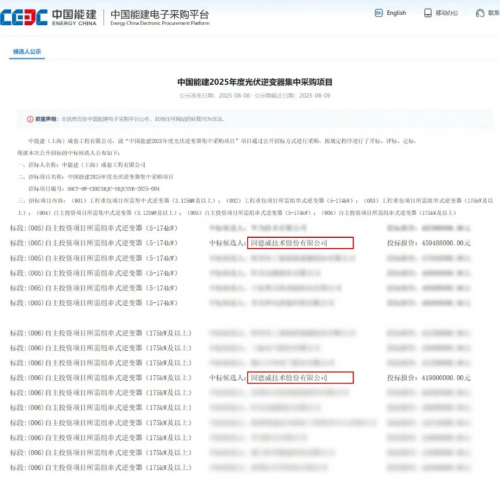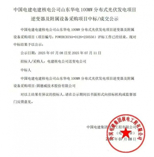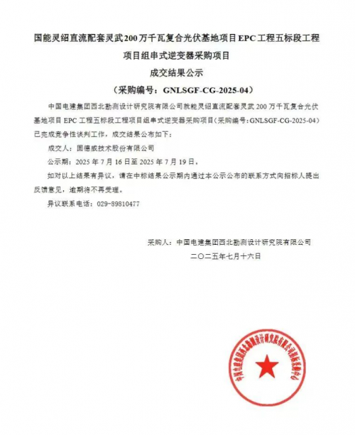 近日,固德威连续成功中标、入围多个央国企大型集采项目,展示了在大型光伏项目上的突出实力!成功中标国能灵绍直流配套灵武2GW复合光伏基地EPC工程五标段组串式逆变器采购项目;成为中国电建核电公司山东华电100MW分布式光伏发电项目的核心逆变器供应商;同时入围中国能建2025年度20GW逆变器集采名单!这些项目分别覆盖大型复合光伏基地、百兆瓦级分布式场景及GW级规模化集采,充分彰显了固德威在光伏全场景应用中的技术*地位、制造交付能力以及系统化服务能力。