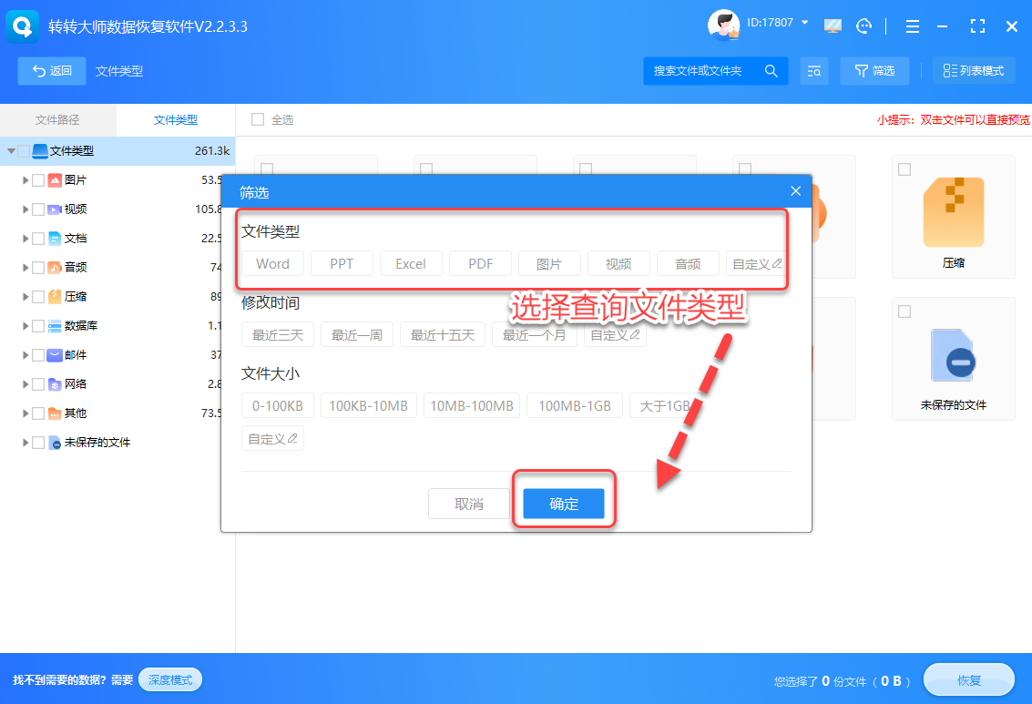 勾选文件所在分区→按"文件类型+修改日期"筛选,3分钟定位目标文件。