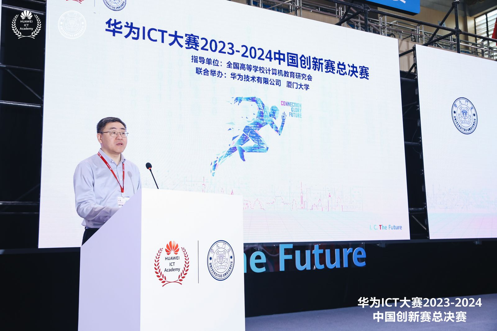 教育部高校计算机类专业教指委副主任傅育熙担任本届创新赛总决赛评委组组长,他代表评委组致辞表示:华为ICT大赛是一个在信息技术领域具有世界影响力的创新大赛,在场的各高校参赛代表队能脱颖而出,代表你们作品的商业价值和社会价值获得认可。评审组将秉持公平公正原则,以评审标准为准绳,以事实为依据,评选出优秀作品,推动技术创新。